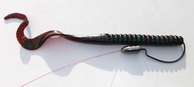 Färdigknuten carolina rig med en float bead. Flytkulan gör att betet blir svävande eller till och med flyter vid spinnstopp. Väldigt effektivt när fisket är trögt eller vattnet är kallt. Aber manchmal hat es die Nase vorn. Durch das Stück Schnur zwischen Haken und Gewicht sinkt der Köder auf dem letzten Stück extrem langsam und verführerisch ab.