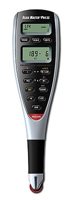 Skalpennan mäter längder oavsett form och beräknar rektangulära ytor och volymer. Skalpennan omvandlar den uppmätta sträckan i de skalor och dimensioner som önskas. SCALE MASTER PRO XE En lättanvänd skalpenna för mätningar från arkitekt- och konstruktionsritningar. Den nya ergonomiska designen gör den bekväm att hålla i, och de dubbla LCD-skärmar gör det mycket lättare att läsa.